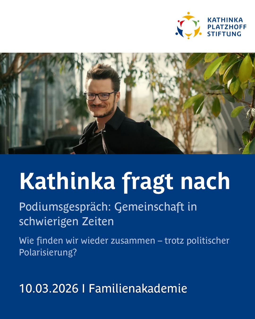 Am 10. März 2026 lädt die Familienakademie Kathinka-Platzhoff-Stiftung zu einem Podiumsgespräch unter dem Titel Kathinka fragt an: Gemeinschaft in schwierigen Zeiten ein.