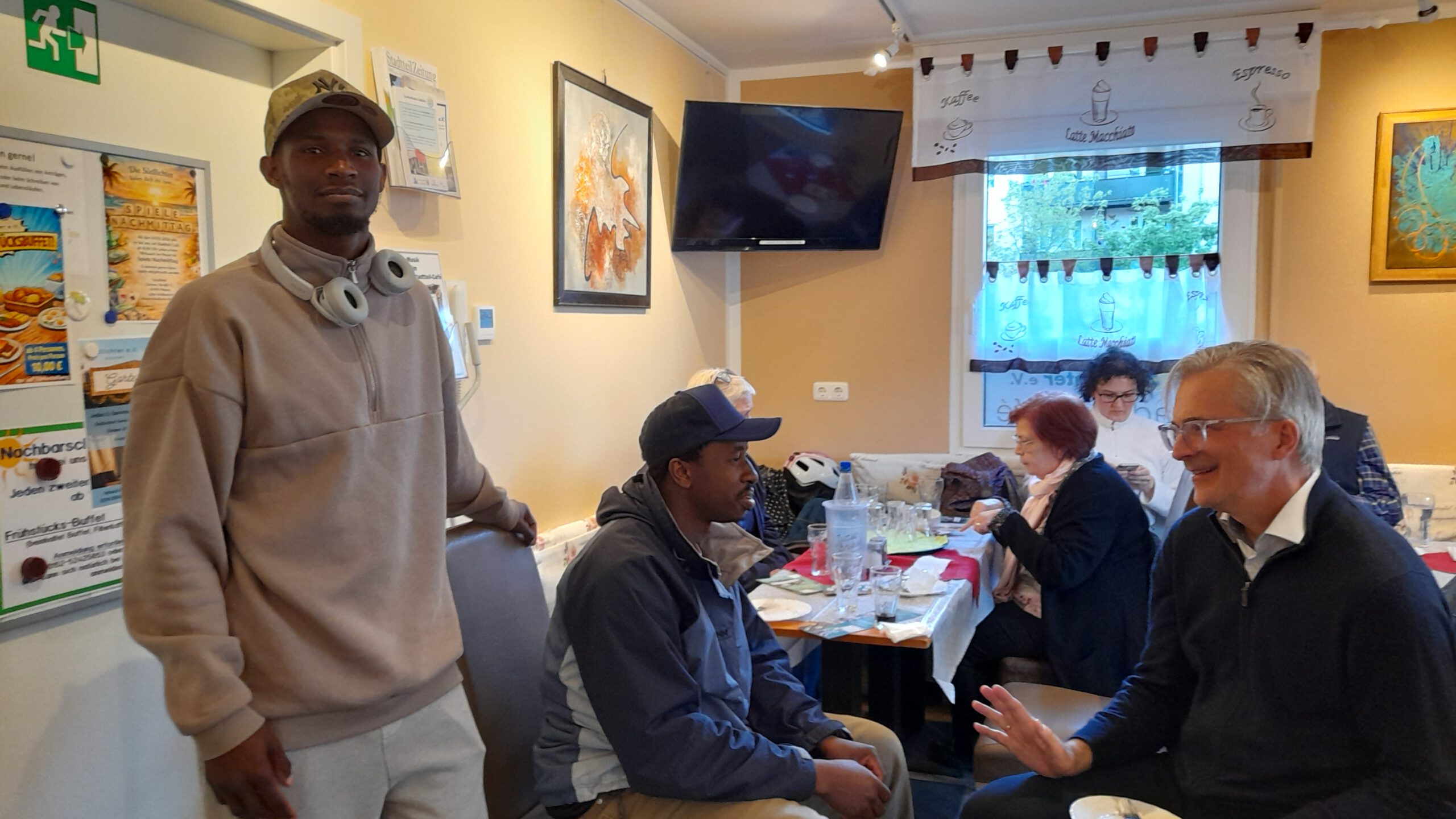 Das gemütliche Stadtteilcafé des Vereins Südlichter e.V. erwies sich als perfekter Ort für das Treffen. Nach der allgemeinen Begrüßung durch Calle (Dr. Karl-Heinz Leister) hatte Erik Rahn das Wort. Er ist Projektleiter der „Alt & Jung – Chancenpatenschaften“ für die Bundesarbeitsgemeinschaft Seniorenbüros (BaS) und reiste für das Treffen extra aus Bonn an. Erik Rahn gab Einblicke in das Bundesprogramm „Menschen stärken Menschen“, an dem sich die BaS seit 2016 beteiligt und in dessen Rahmen das Chancenpaten-Projekt von der BaS umgesetzt wird. Ziel der Chancenpatenschaften ist die Integration von geflüchteten Menschen sowie die Förderung gesellschaftlicher Teilhabe von sozial benachteiligten Menschen, wie auch z.B. von Alleinerziehenden oder Menschen mit geringer Bildung. Überwiegend etwas ältere Menschen unterstützen jüngere Mentees und verbessern dadurch nicht nur die individuelle Situation sondern fördern damit auch den gesellschaftlichen Zusammenhalt.