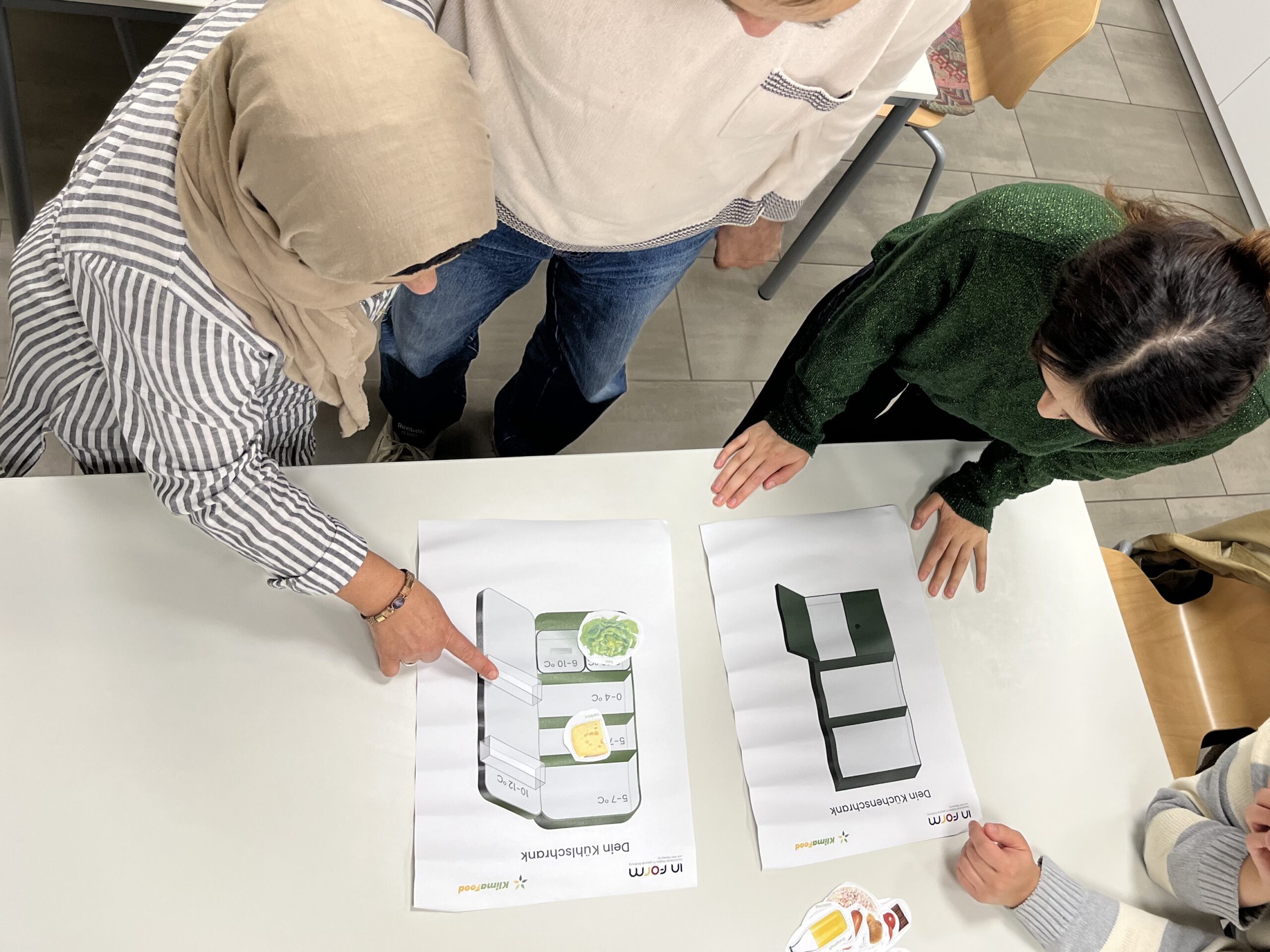 2 Frauen zeigen auf 2 Blätter Papier