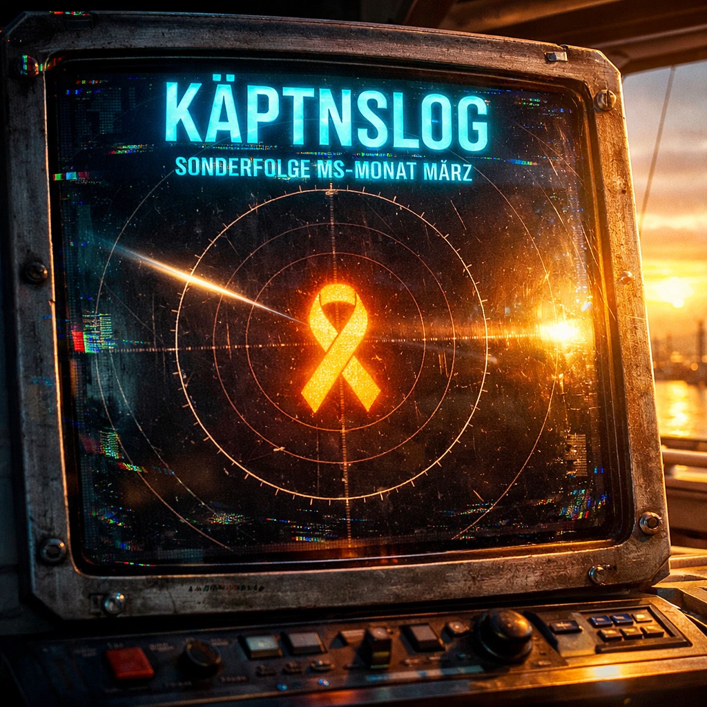 Auf dem Plakatfoto mit dem Titel “Käptenslog-Sonderfolge MS-Monat März“ sieht man einen Monitor. Auf dem Monitor ist eine Radaranzeige. In der Mitte der Anzeige ist eine orange MS-Bewusstseins-Schleife zu sehen.