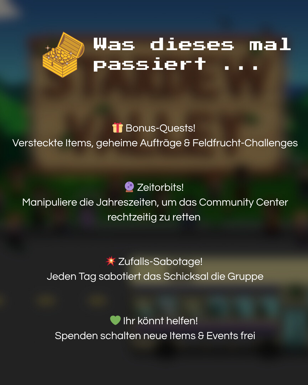 Was dieses mal passiert... Zusätzliche Aufgaben! Versteckte Gegenstände, geheime Aufträge und Feldfrucht-Herasuforderung Zeitorbits! Mainpuliere die Jahreszeiten, um das Gemeinschafts-Zentrum rechtzeitig zu retten Zufalls-Sabotage! Jeden Tag sabotiert das Schicksal die Gruppe. Ihr könnt helfen! Spenden schalten neue Gegenstände und Ereignisse frei