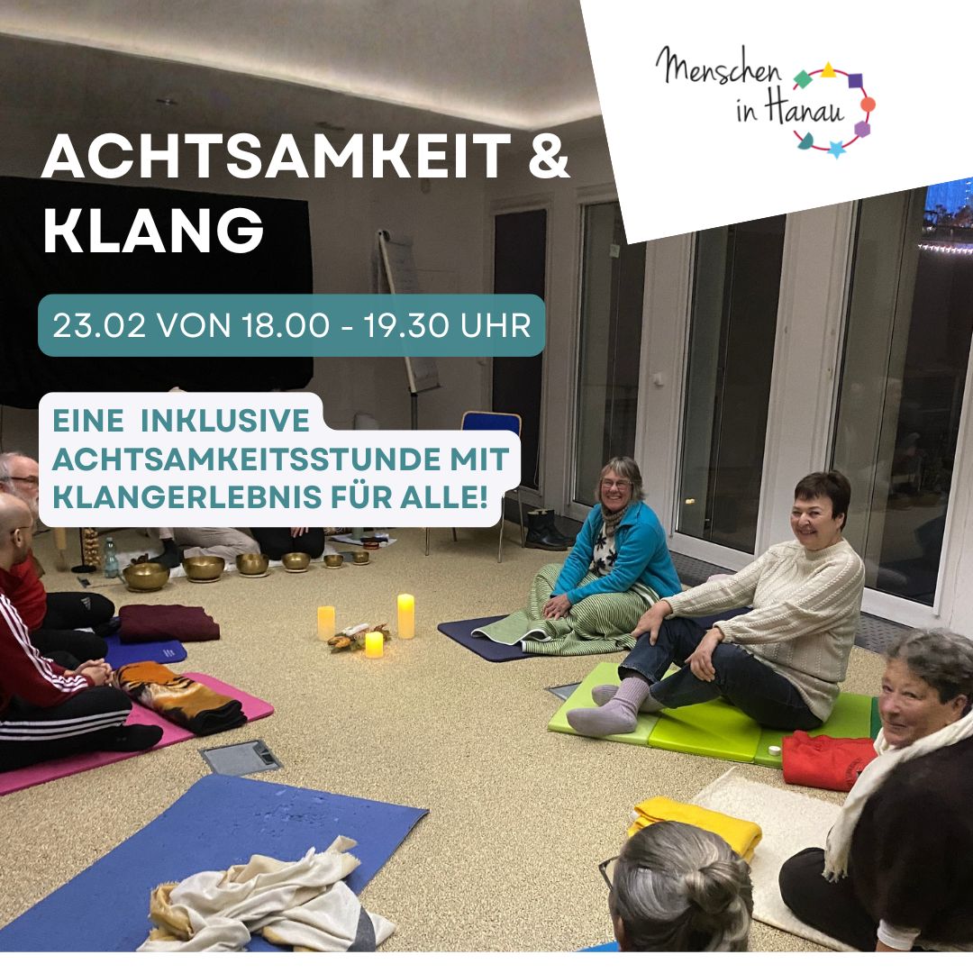 Mehrere Leute sitzen in einem Kreis. Werbung für die Inklusive Achtsamkeitsstunde