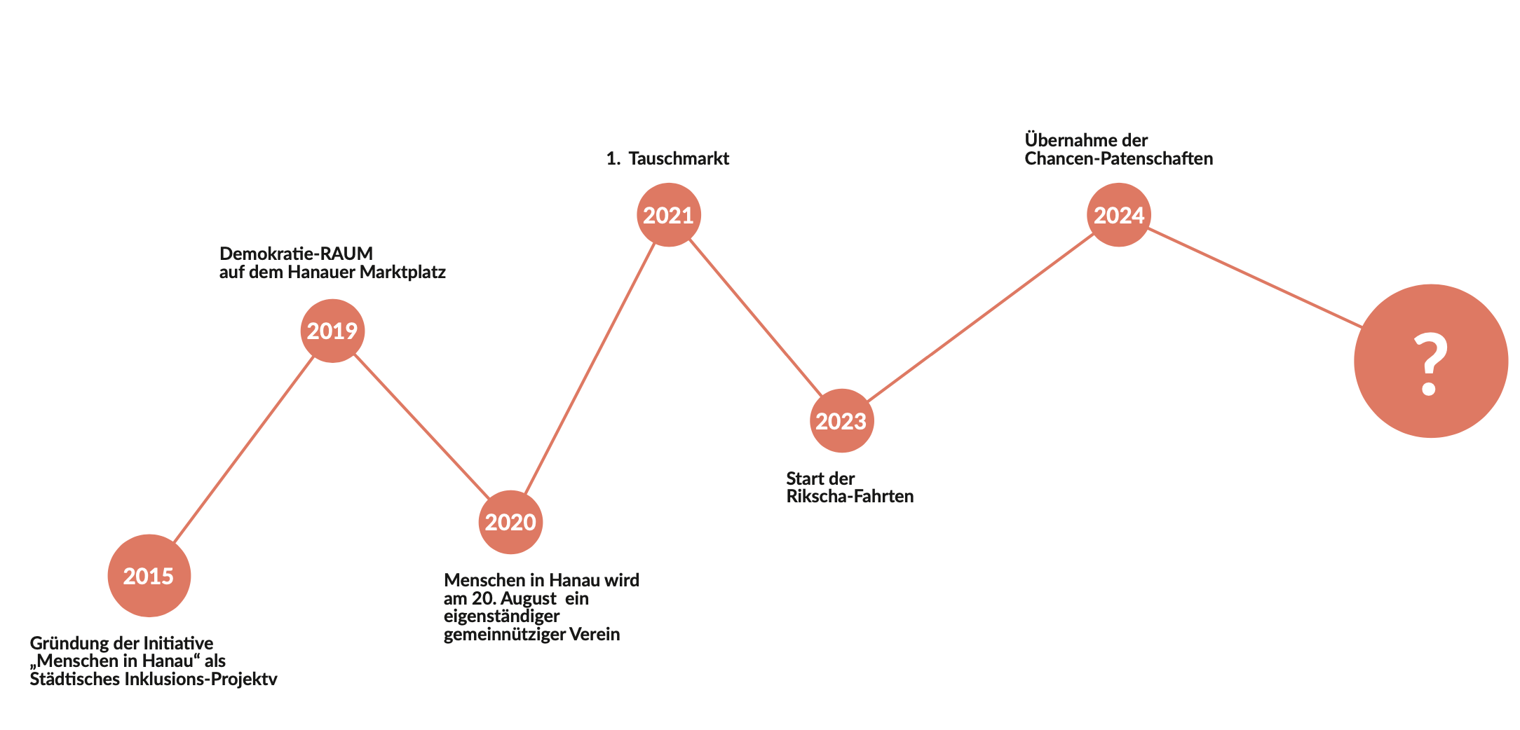 Ein orangener Zeitstrahl der die zeitlichen Stationen des Vereins zur Gründung zeigt.